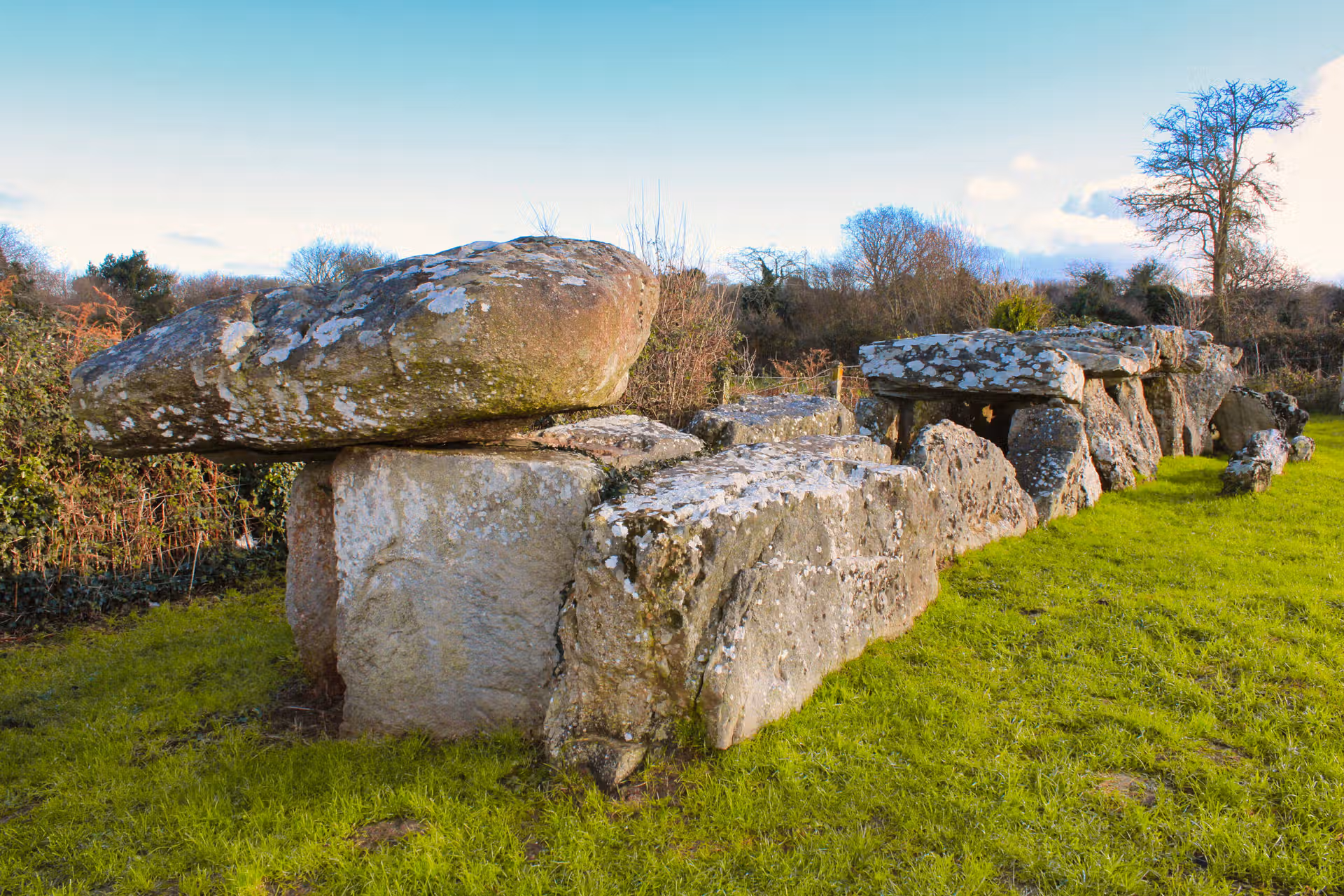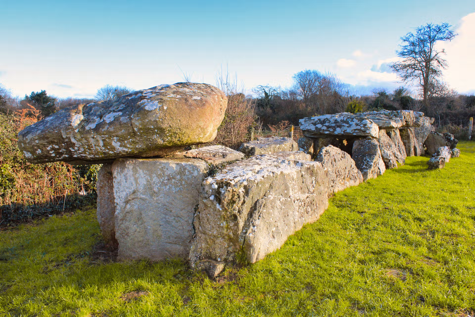 En janvier 2021, sous un ciel d’un bleu limpide traversé de nuages d’hiver, je me suis rendu à la Sépulture mégalithique de La Forge. Posée dans un écrin d’herbe verte et bordée de haies nues, elle semble presque modeste au premier regard. Et pourtant, ces pierres massives portent en elles plusieurs millénaires d’histoire.