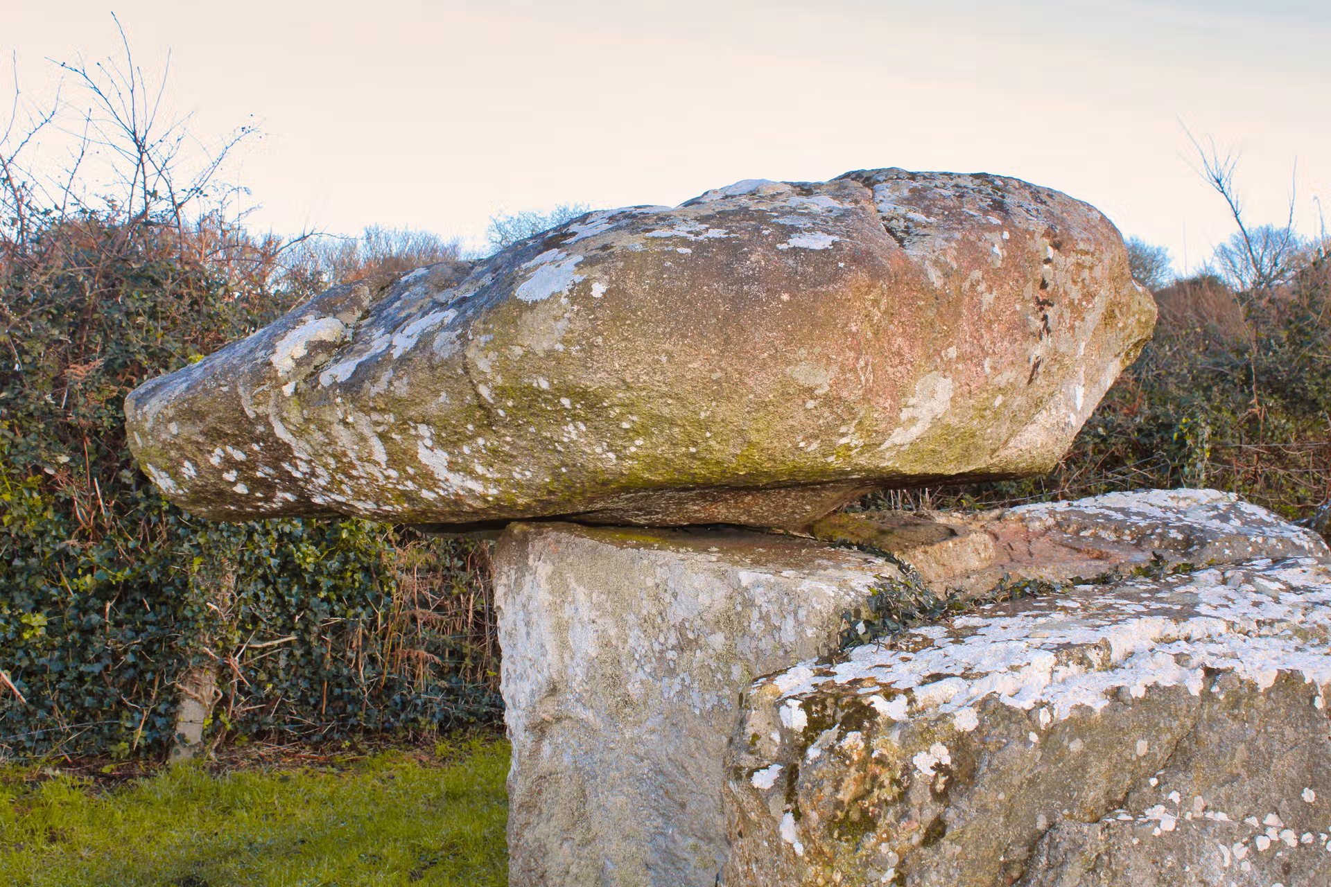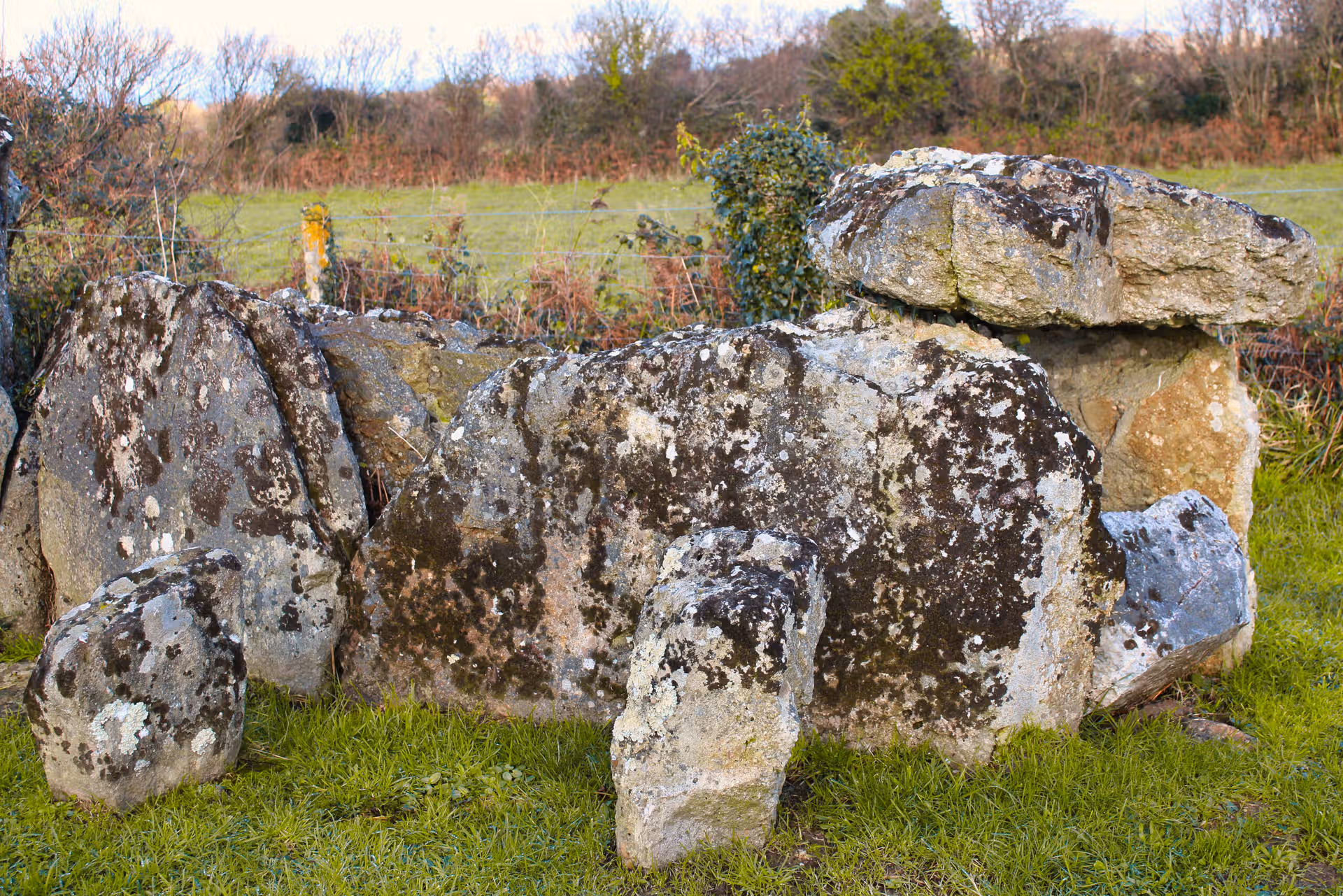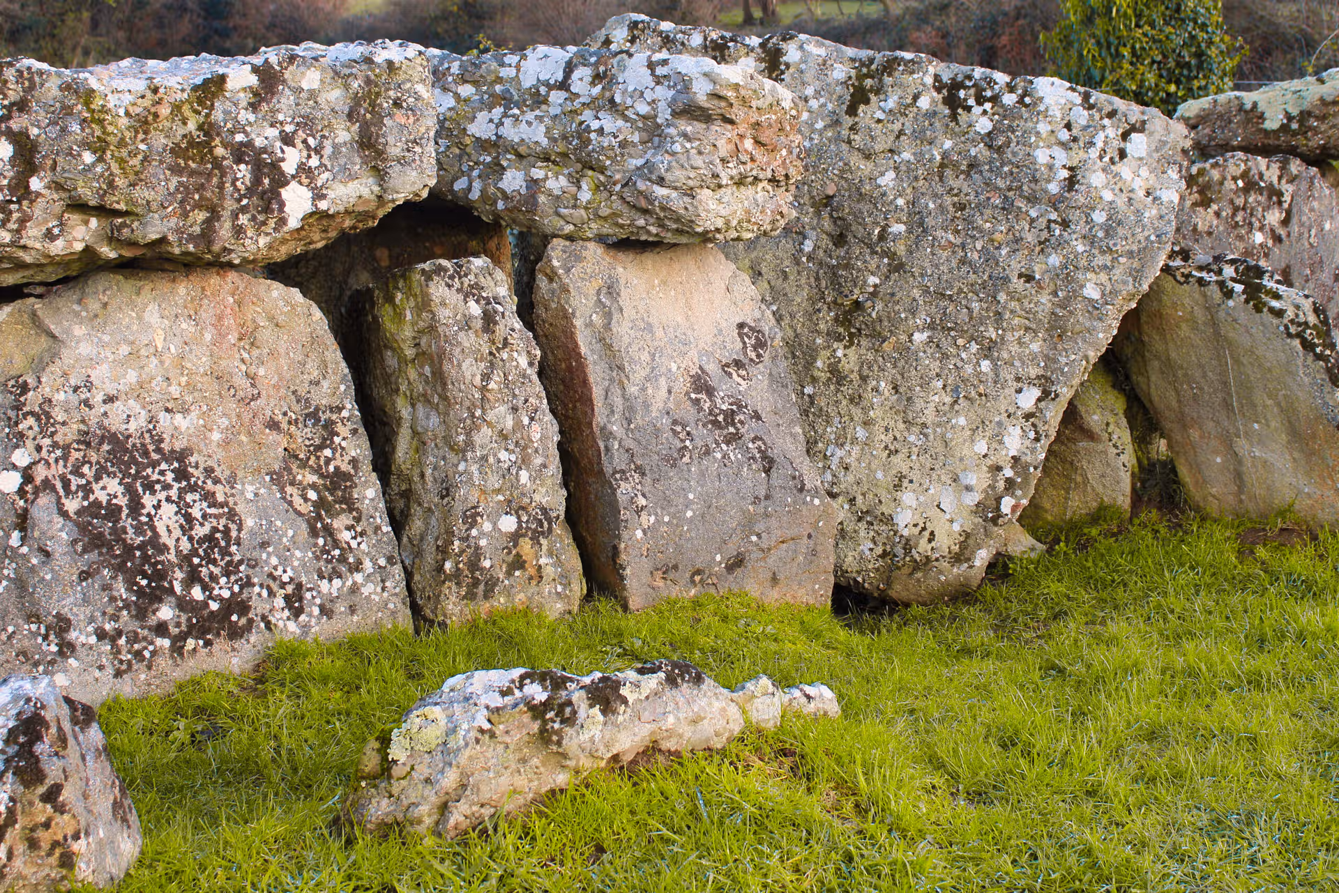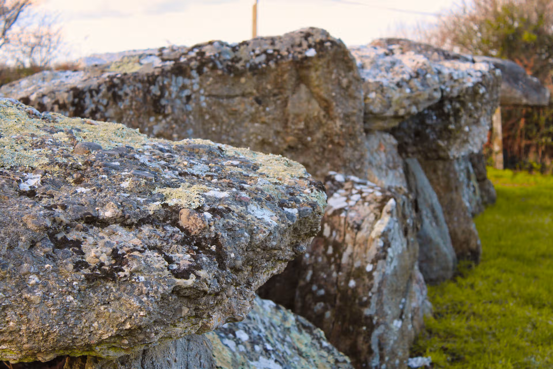 En hiver, la lumière rasante révèle toute la texture de la pierre. Les aspérités, les mousses, les fractures naturelles deviennent presque tactiles. La nature reprend doucement ses droits : fougères dans les interstices, lierre accroché aux parois, herbe dense au pied des orthostates.