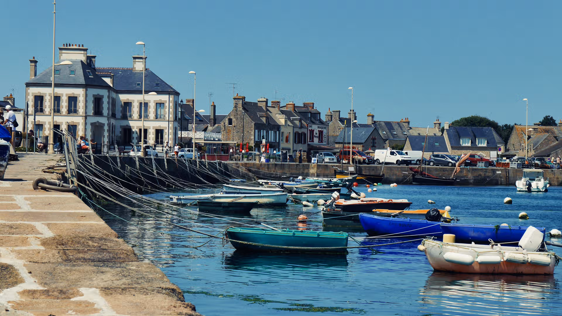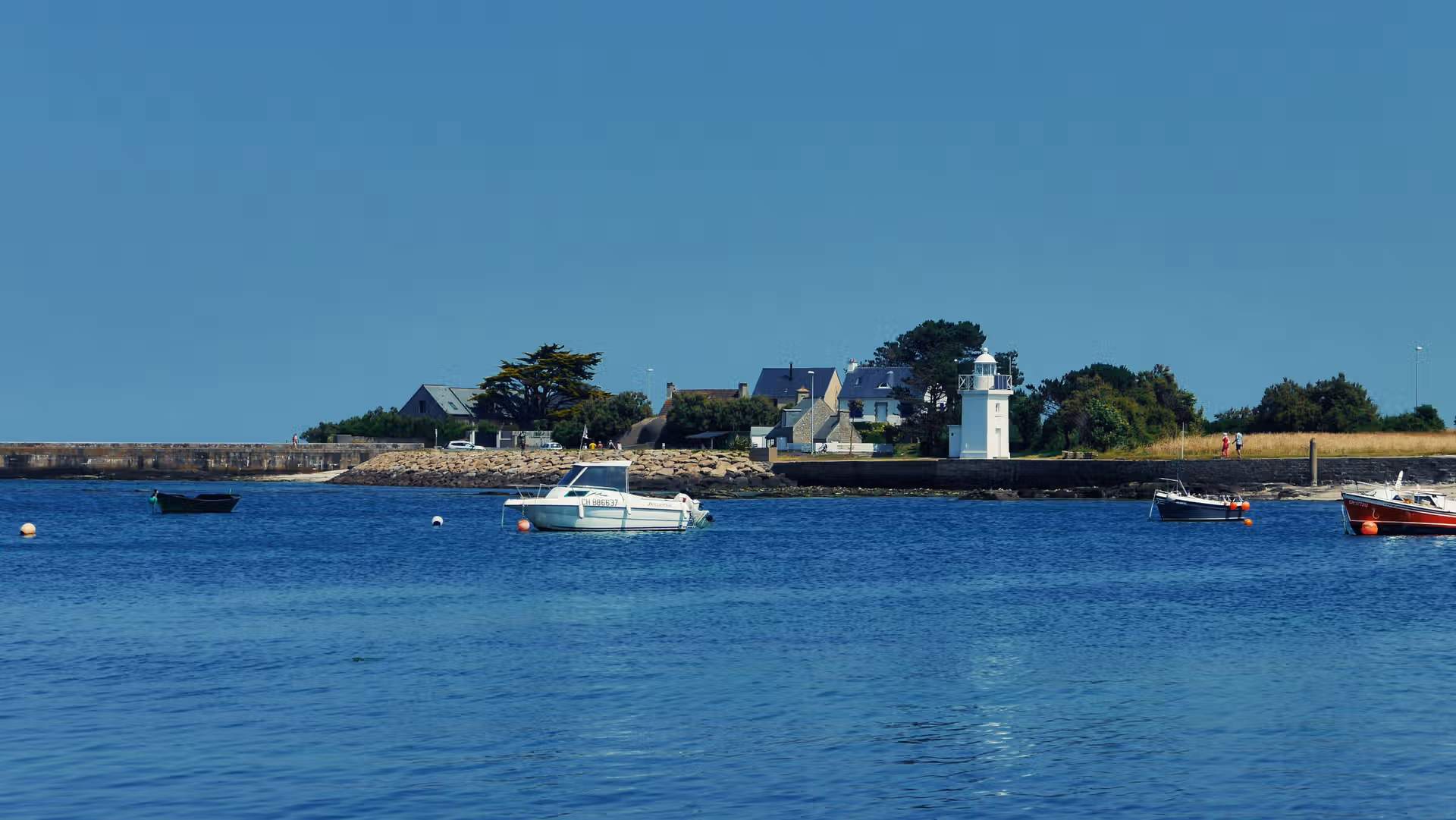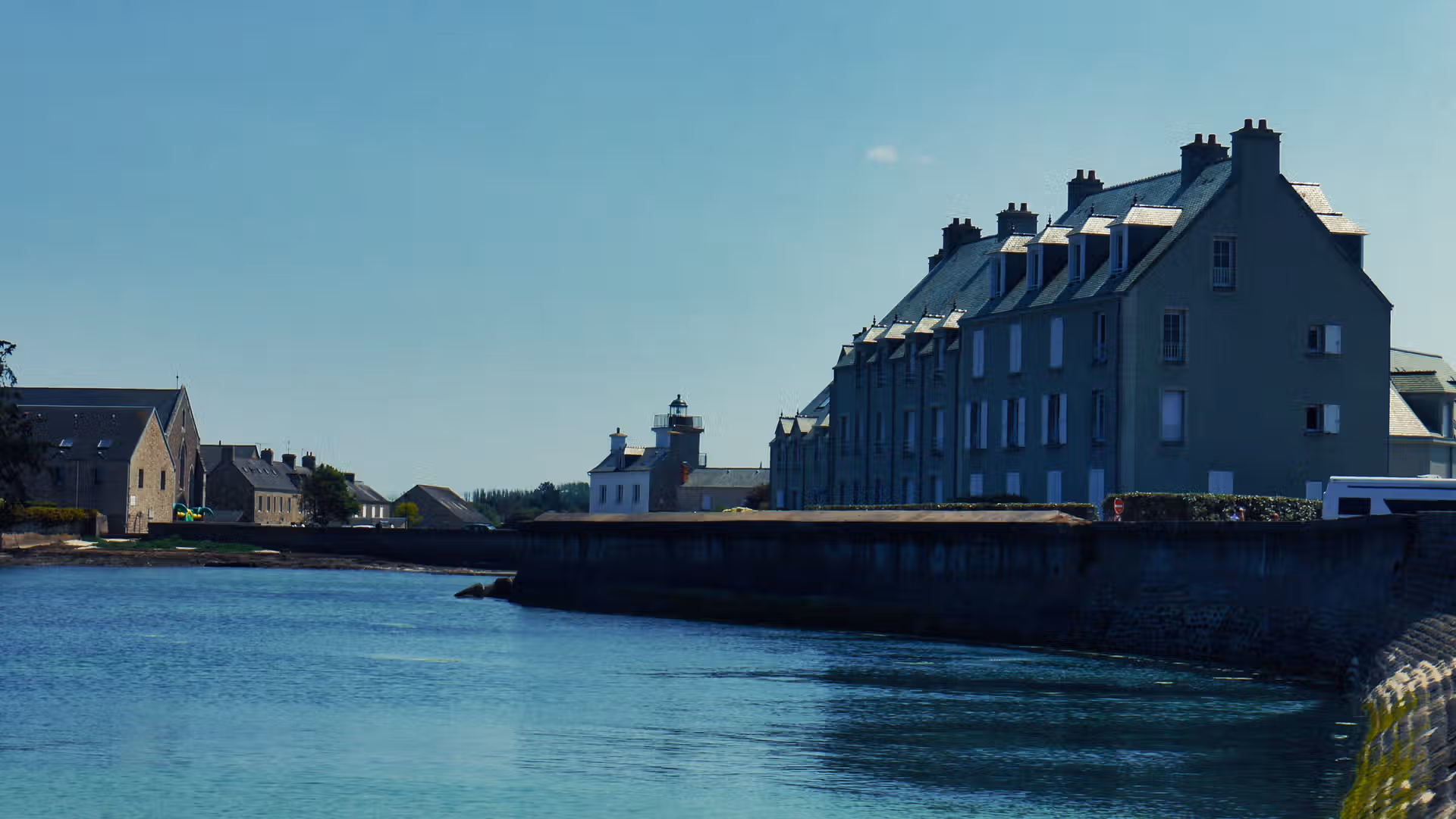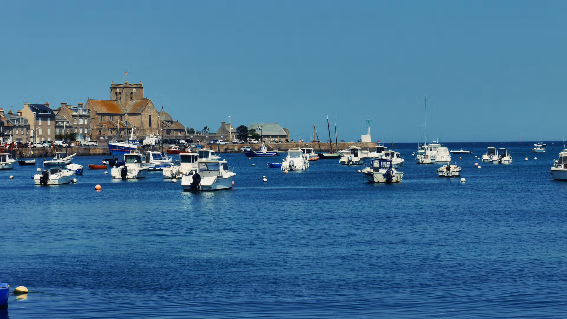 Dominant la scène, l’imposante église Saint-Nicolas veille sur la jetée. Elle s’intègre parfaitement au paysage, comme une sentinelle de pierre face aux vents. Plus loin, le petit phare blanc offre une vue superbe sur le port, les maisons serrées les unes contre les autres, et les barques reposant paisiblement à marée basse.