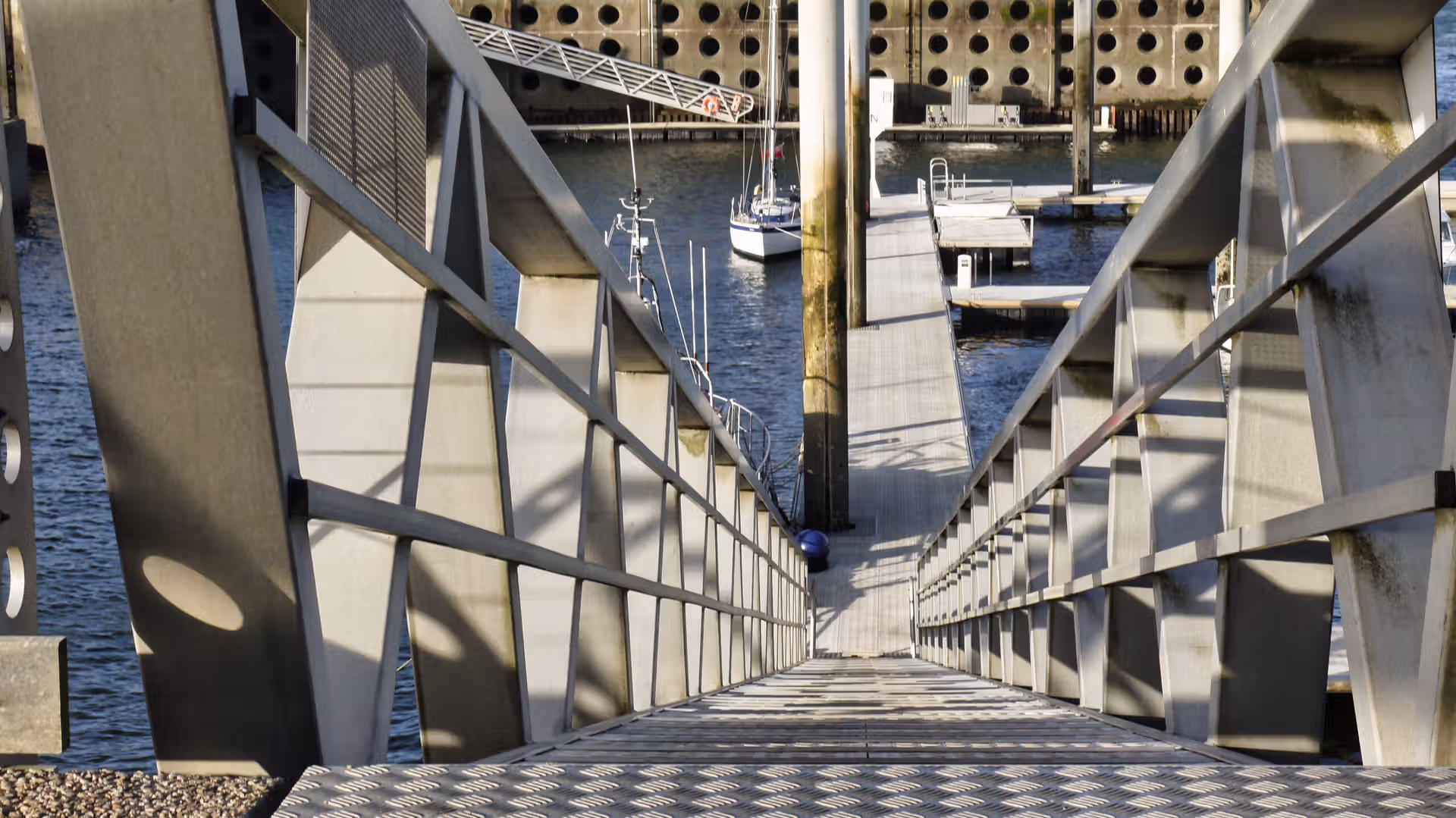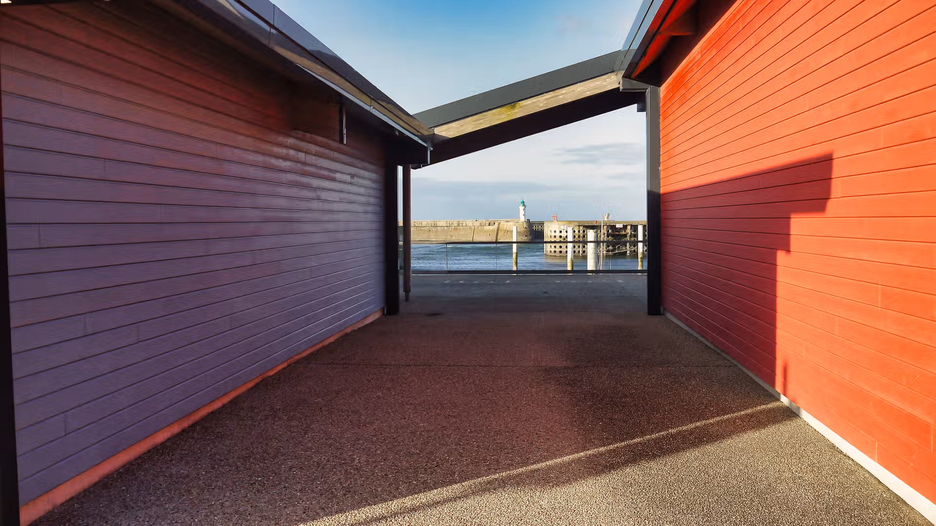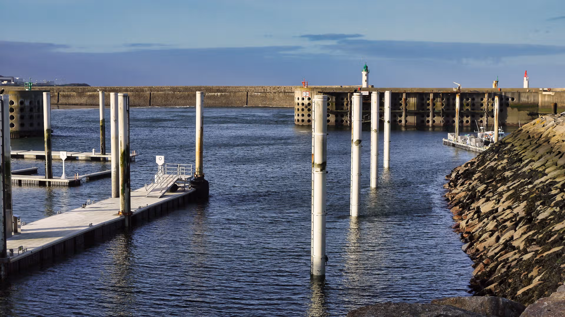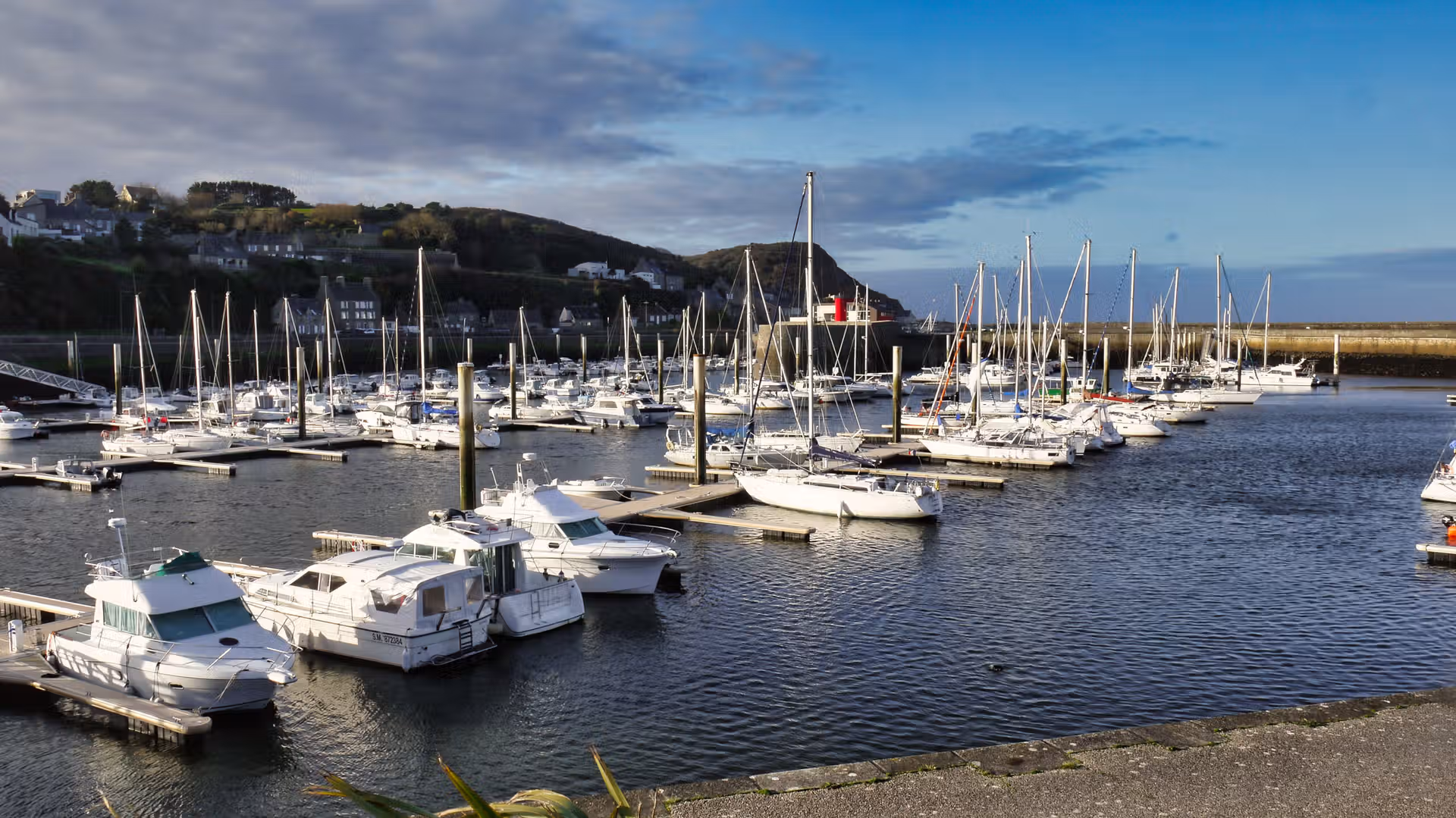 Sur ces images, le regard est guidé par des lignes nettes : mâts verticaux, pontons rectilignes, digue massive qui ferme l’horizon. La mer est contenue, disciplinée par l’architecture du port, tandis que le ciel, lui, garde une liberté plus incertaine, partagé entre nuages et éclaircies. La lumière de février, basse et précise, souligne chaque détail sans jamais forcer le contraste.
