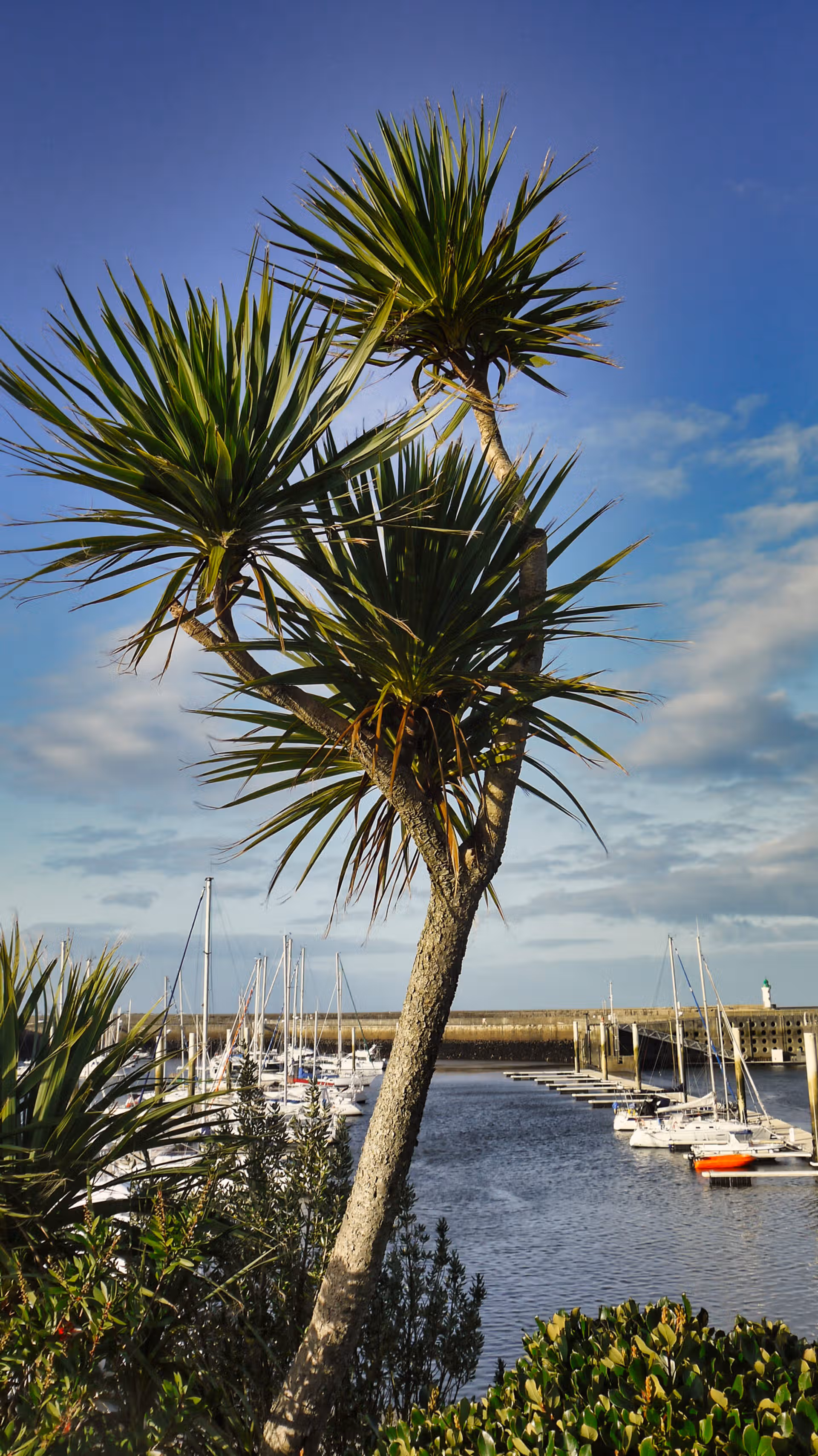 La présence inattendue des palmiers apporte une douceur presque paradoxale. À Dielette, ils dialoguent avec le béton, le bois et l’eau sombre du bassin. Ils rappellent que ce port n’est pas seulement un lieu de passage, mais aussi un espace de vie, protégé, à l’écart des fureurs du large.